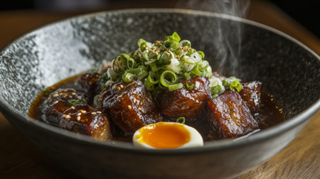 A beautiful plate featuring tender braised pork belly topped with scallions and a soft egg, creating a warm, savory meal ideal for any dining occasion.