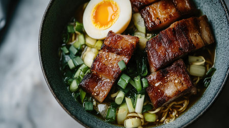 A visually enticing bowl of ramen featuring succulent pork belly and a soft-boiled egg, garnished with fresh scallions, perfect for any food lover.