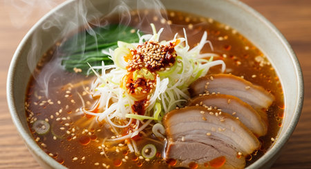 A close-up shot of a hot and savory bowl of spicy ramen, featuring tender slices of pork belly, fresh green onions, and a drizzle of vibrant chili oil.