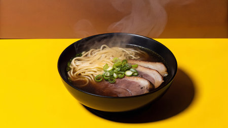 A steaming bowl of ramen features tender pork slices and green onions, beautifully arranged in a rich broth, set against a bright yellow backdrop, creating an appetizing scene