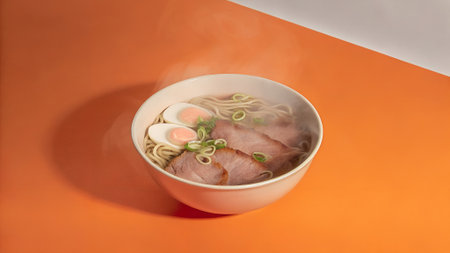 Steaming bowl of ramen featuring tender meat, soft-boiled eggs, and green onions, set against a bright orange backdrop, highlighting the dish's appetizing appeal
