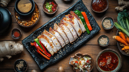 A beautifully arranged plate of sliced grilled meat accompanied by vibrant vegetables and a variety of sauces, perfect for showcasing culinary artistry and flavor.