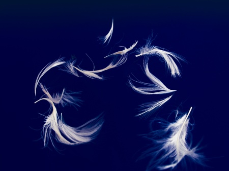 Abstract White Bird Feathers Floating in The Dark. Flying Feathers on Black.
