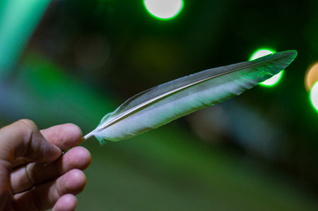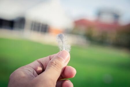 The hand holding the feather of a bird. Close up. Isolated on white background