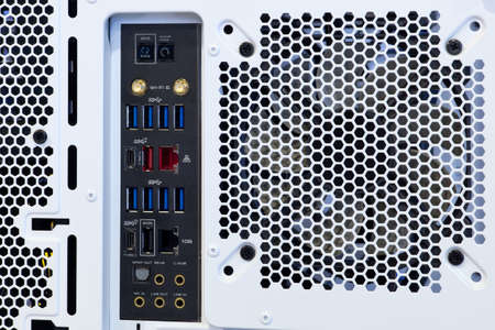 Close-up multi data transfer port connector on High Performance Motherboard Computer and cooling fan from back panel of Desktop PC Tower Case Unit