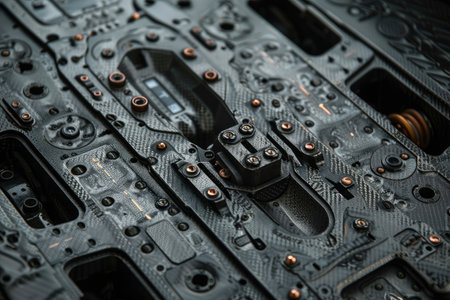 High-angle, detailed image of a complex, layered mechanical structure with numerous small parts, screws, and rivets.