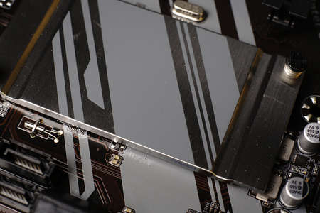 Close-up of a modern computer motherboard. Electronic computer hardware technology