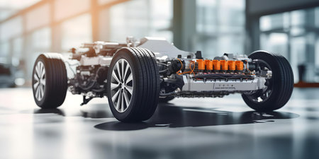 Car chassis, engine with connected gearbox, exhaust manifold, cardan shaft, suspension. mild hybrid system,