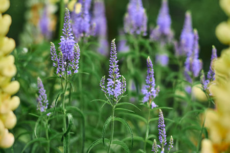 Vibrant purple flowers stand tall among rich green foliage, showing their beauty in a lively garden during the spring season.
