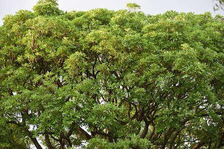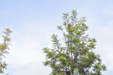 Canopy of evergreen tree in urban park in the summer.