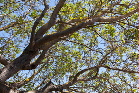 Branch trees against blue sky, bottom view. Natural green leave tree background with copy space with low angle view. Scene of fresh foliage and room for copy text, environment ecology concept