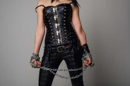 Arrest and jail. Criminal angry woman prisoner girl showing leather handcuffs on gray. Punishment.