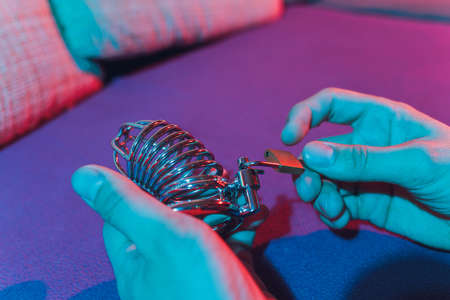 Iron handcuffs in the man's hands on a blue background. A sex toy.