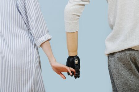 Husband and wife holding hands. Living hand and bionic prosthetic hand joined together. Over blue background. Cropped, no head.