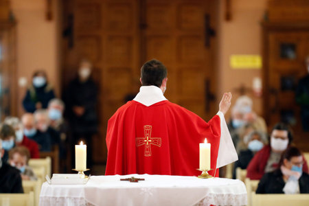 In Grand Old Church Minister Leads The Holy Communion Ceremony, Guiding Christian Congregation Through Eucharist, Sharing Wisdom and Guidance of the Bible, Offers Support And