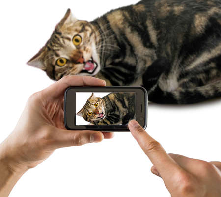 A person photographing her cat with a cell phone. Woman taking a photo with the camera of a smartphone.