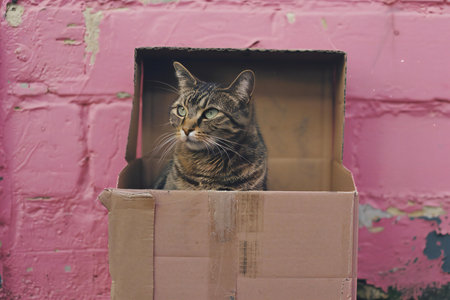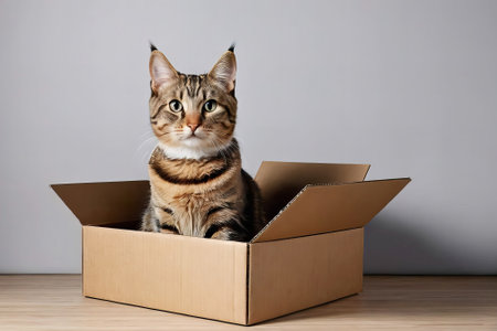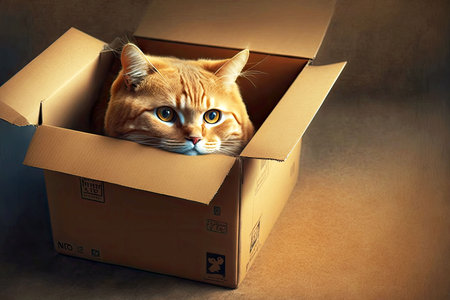 Cat sitting inside a cardboard box with a mischievous look, surrounded by soft shadows