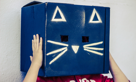 Photograph of a teen with a black cat carton box mask