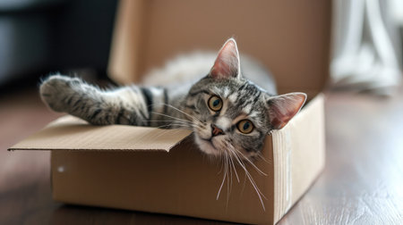 Cute grey tabby cat in cardboard box on floor at home --ar 16:9 --v 6 Job ID: 150467a7-fff3-4d37-8bea-f79e459cf37e