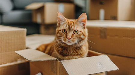 Moving and donation concept stack of cardboard boxes with cat inside, new home transition