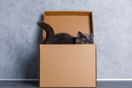 Portrait of funny gray kitty cat sitting in an parcel delivery cardboard box