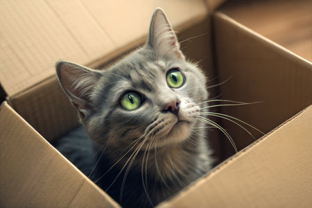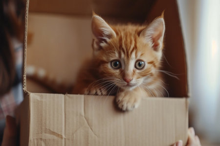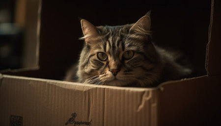 Fluffy kitten sitting in cardboard box, staring with curiosity generated by artificial intelligence
