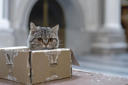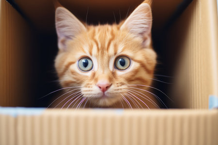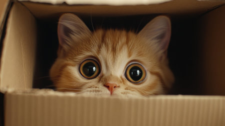An adorable chubby cat peeking out from a cardboard box, its eyes wide with curiosity and mischief.