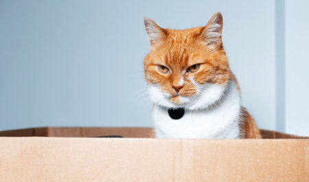 Portrait of red-white cat sitting in the cardboard box. Close-up view.