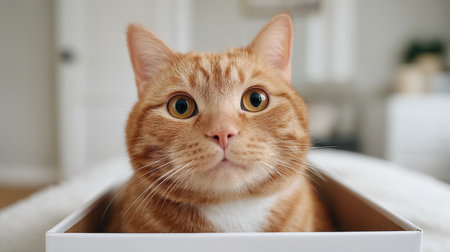 A charming ginger cat peeks out from a white box in a cozy indoor setting, showcasing its playful personality and curious expression in a heartwarming moment.