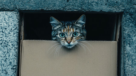A curious cat peeks out of a cardboard box in an urban environment, showcasing its playful demeanor and expressive eyes, perfect for pet lovers.