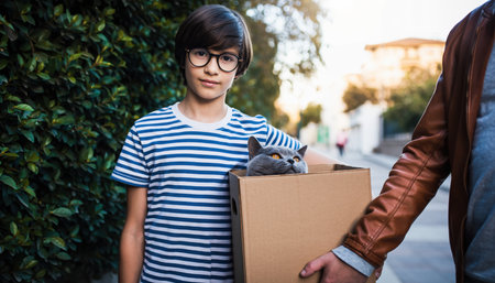 A young boy wearing glasses and a striped t-shirt holds a cardboard box containing a cat.