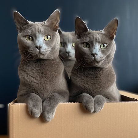 Generative AI : Russian blue cat in a cardboard box house The cat and kitten are playing Zero waste for animals Eco friendly animal home Selective focus