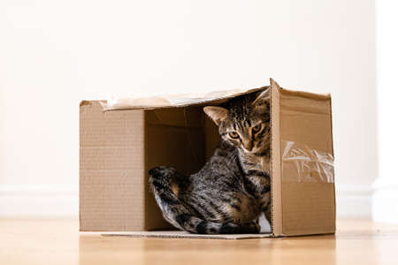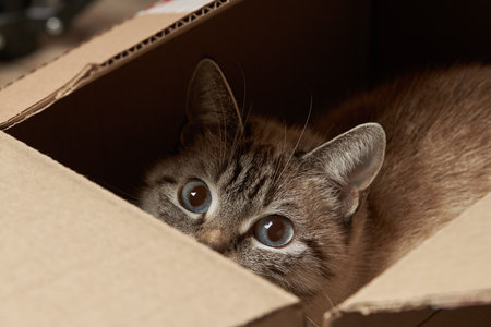 Funny tabby cat in a cardboard box on the floor. Parcel with pet friend. Grey kitten with beautiful eyes playing indoors