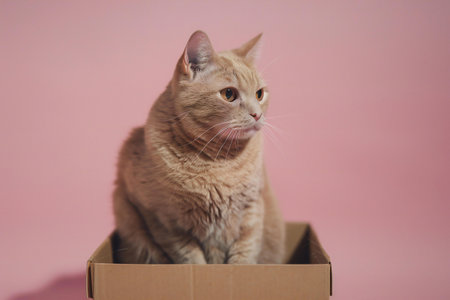 ginger cat sitting in a cardboard box on a pink background.