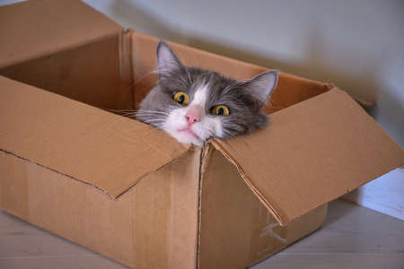 Cute little gray cat peeking out of the window at an open box on wooden floor