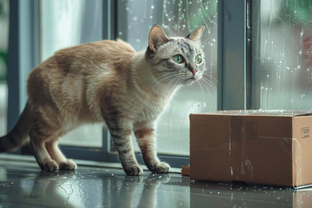 Cute cat looking through the window with a box in the background