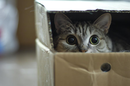A curious cat peers out of a cardboard box, its eyes wide with interest, A curious cat peeking out from a cardboard box, AI Generated