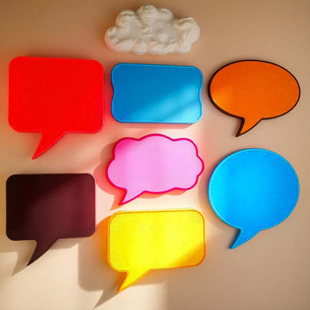 Colorful speech bubbles with textured patterns on a dark surface, representing conversation, messages, and abstract concepts.