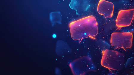 Communication concept on a dark blue polygonal background with glowing speech bubbles. Ideal for e-commerce and virtual networking themes with clear copy space.