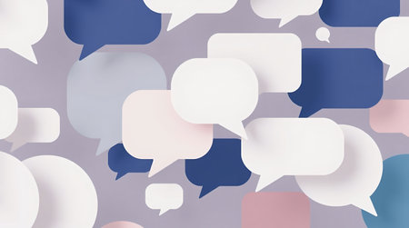 Four vibrant speech bubbles in pink, orange, and blue, overlapping against a soft-focus background, representing conversation.