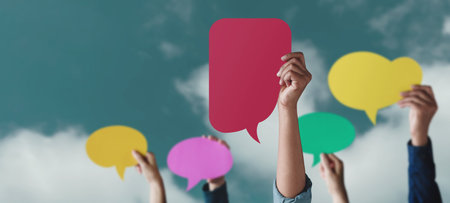 Peaceful, Human Rights and Freedom to Speak and Expression. Group of People Protesting or making Campaign by Raise up a Blank Speech Bubble Card into the Sky
