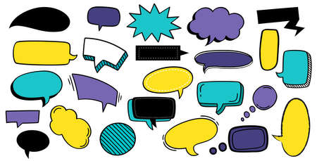 Speech bubbles. Hand drawn trendy design cartoons elements. Communication tags. Vector illustration doodle colorful text banners set communication clouds, comic cartoon sticker
