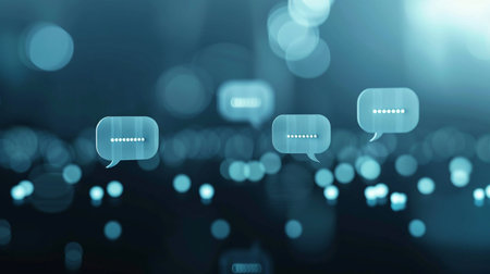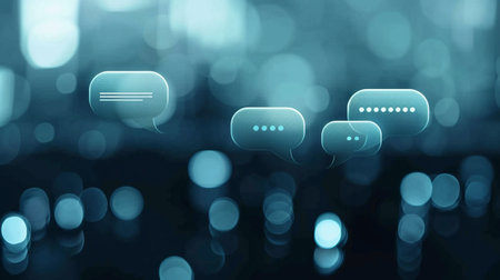 Glowing blue speech bubbles and soft bokeh lights create an abstract digital background symbolizing communication and connectivity in the digital age.