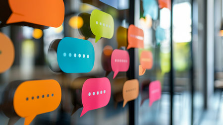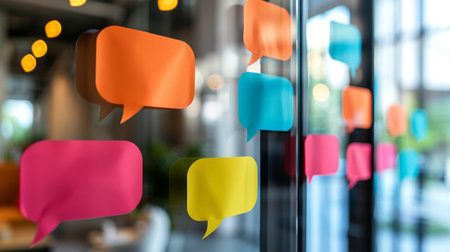 A collection of brightly colored speech bubble shapes affixed to a glass surface, symbolizing conversation and diverse messages.