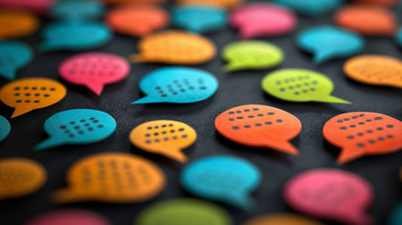 A vibrant collection of speech bubble icons in various colors and dot patterns, artfully arranged on a textured dark surface, symbolizing communication.