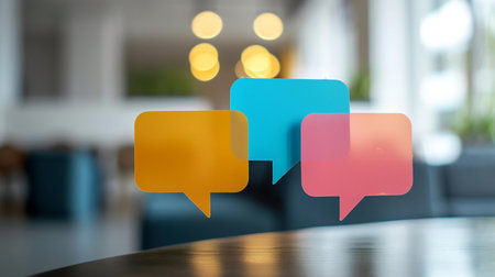 Three semi-transparent colorful speech bubbles in orange, blue, and pink overlap on a table, with a blurred office and bokeh background.