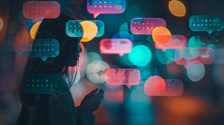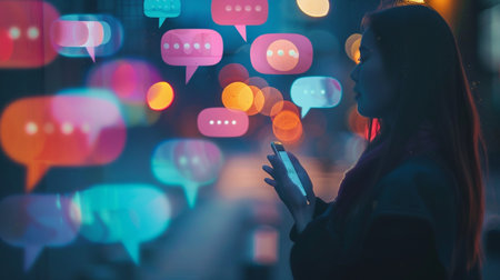 Silhouette of a woman using her phone at night, with vibrant, colorful chat bubbles and blurred city lights in the background, symbolizing online communication.