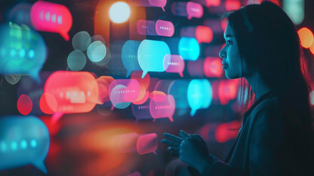 A young woman immersed in a vibrant neon-lit environment filled with digital chat bubbles, representing online connection and social media.