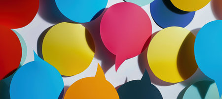 A dynamic arrangement of colorful speech bubbles and circular shapes showcases a mixture of hues, reflecting the energy and diversity of conversation and expression.