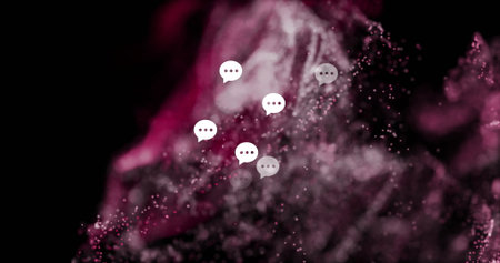 Floating cluster of chat bubble icons with three-dot ellipses in magenta and gray particle clouds. Communication, technology, digital, futuristic, innovation, network, abstract